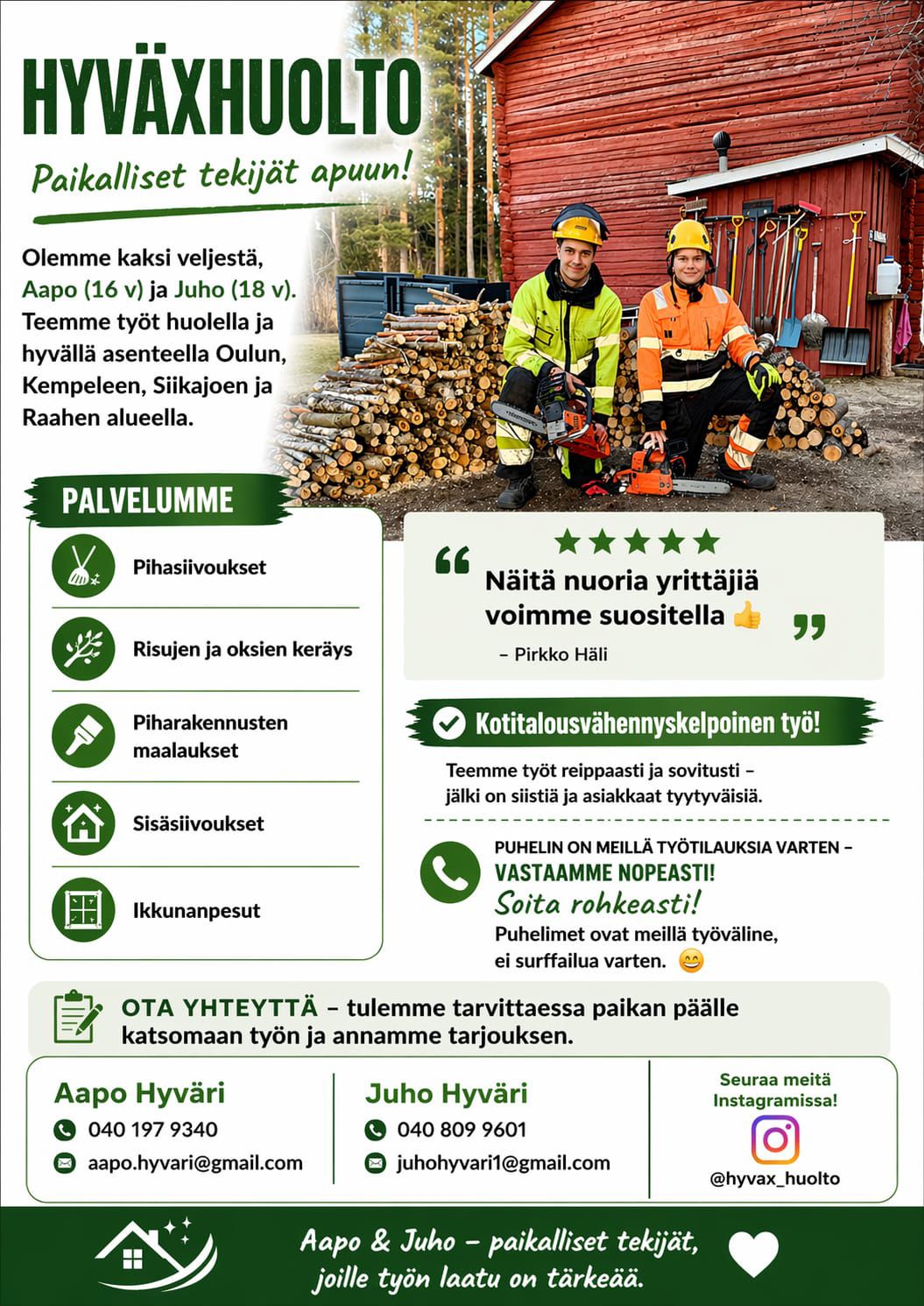 Olemme Aapo 16-vuotias ja Juho 19-vuotias. Teemme sisä ja piha töitä nuoruuden innolla. Meille tärkeää on tehdä työ huolella ja kunnolla. Toimimme Oulu-Kempele-Liminka-Siikajoki-Raahe/pohjoispohjanmaan alueella.